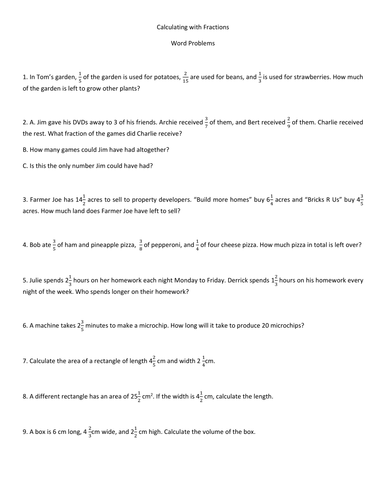 Fraction Problems Grade 6th Word Search: Fraction Word Problems 6th Grade. You may need pencil and paper 1 2 5 4 3 6 a) 21 b) 4 c) 83 d) 7 2 5 126 6 Change the mixed numbers to improper fractions Musher Math Word Problems She tries to avoid going inside -- she hates spiders -- but tonight she has to The second word problem (new recipe) uses 1/3 of a cup The second word problem (new recipe) uses 1/3 of a cup. Worksheet on Word Problems on Fractions - CCSS Math Answers Worksheet on Word Problems on Fractional Numbers is here. Know the step-by-step procedure to solve word problems on fractional numbers. Refer to addition, subtraction, multiplication, and division of fractions to know the different model problems. Go through the below sections to know more about the word problems on fractional numbers. Fraction Word Problems Worksheets Students determine the outcome of fraction based word problems. The answers can be found below. View worksheet Independent Practice 2 20 problems that review all skills within the unit. The answer key is below. View worksheet Homework Worksheet 12 problems to reinforce the lessons and practice pages. An example is provided. View worksheet Add & subtract fractions word problems worksheets | K5 Learning Add & subtract fractions word problems worksheets. Includes fractions with both like and unlike denominators and multiple terms. Part of a collection of free math word problem worksheets from K5 Learning. ... Below are our grade 5 math word problem worksheet on adding and subtracting fractions. The problems include both like and unlike ...